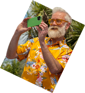 A person wearing a bright floral shirt holding up a green phone while taking a photo outdoors.